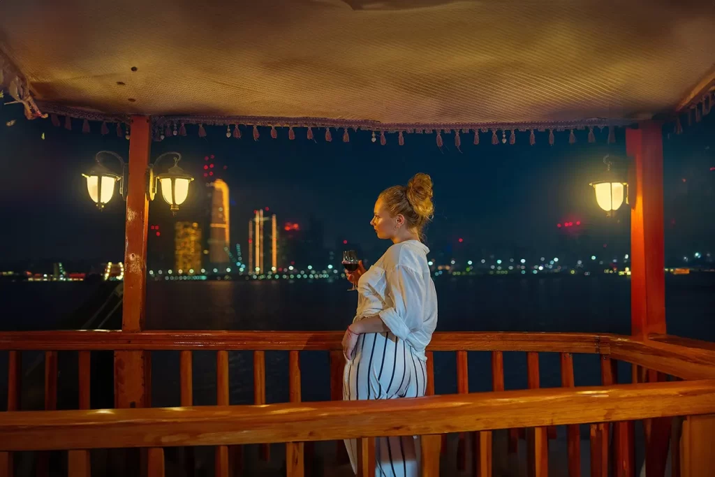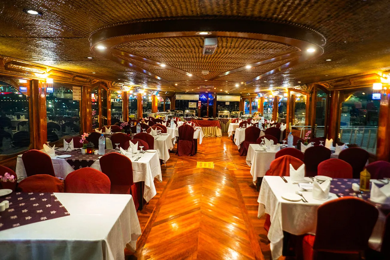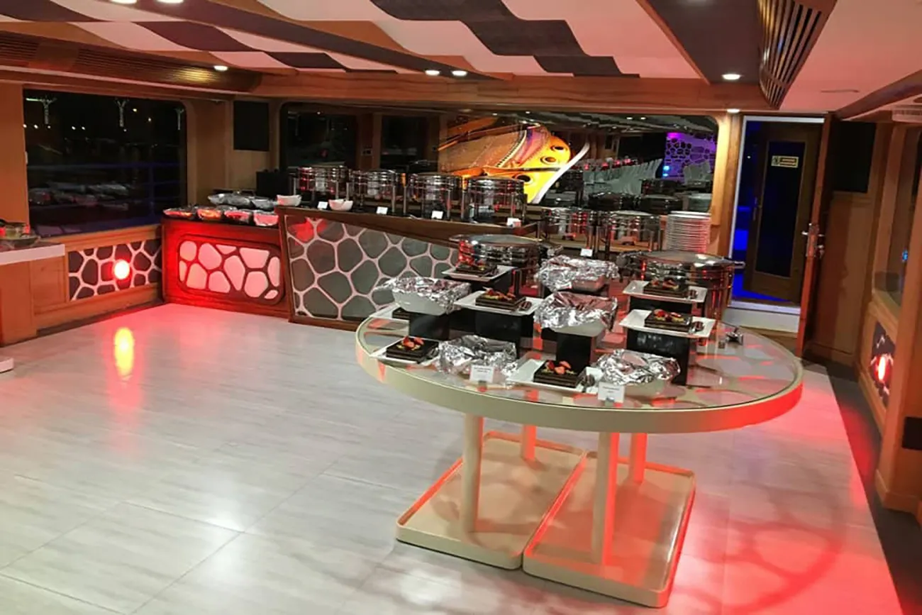 Relax on the upper open-air deck or the cozy air-conditioned lower deck while enjoying a sumptuous buffet dinner featuring Arabic, Asian, and continental dishes, along with a variety of desserts and soft beverages.