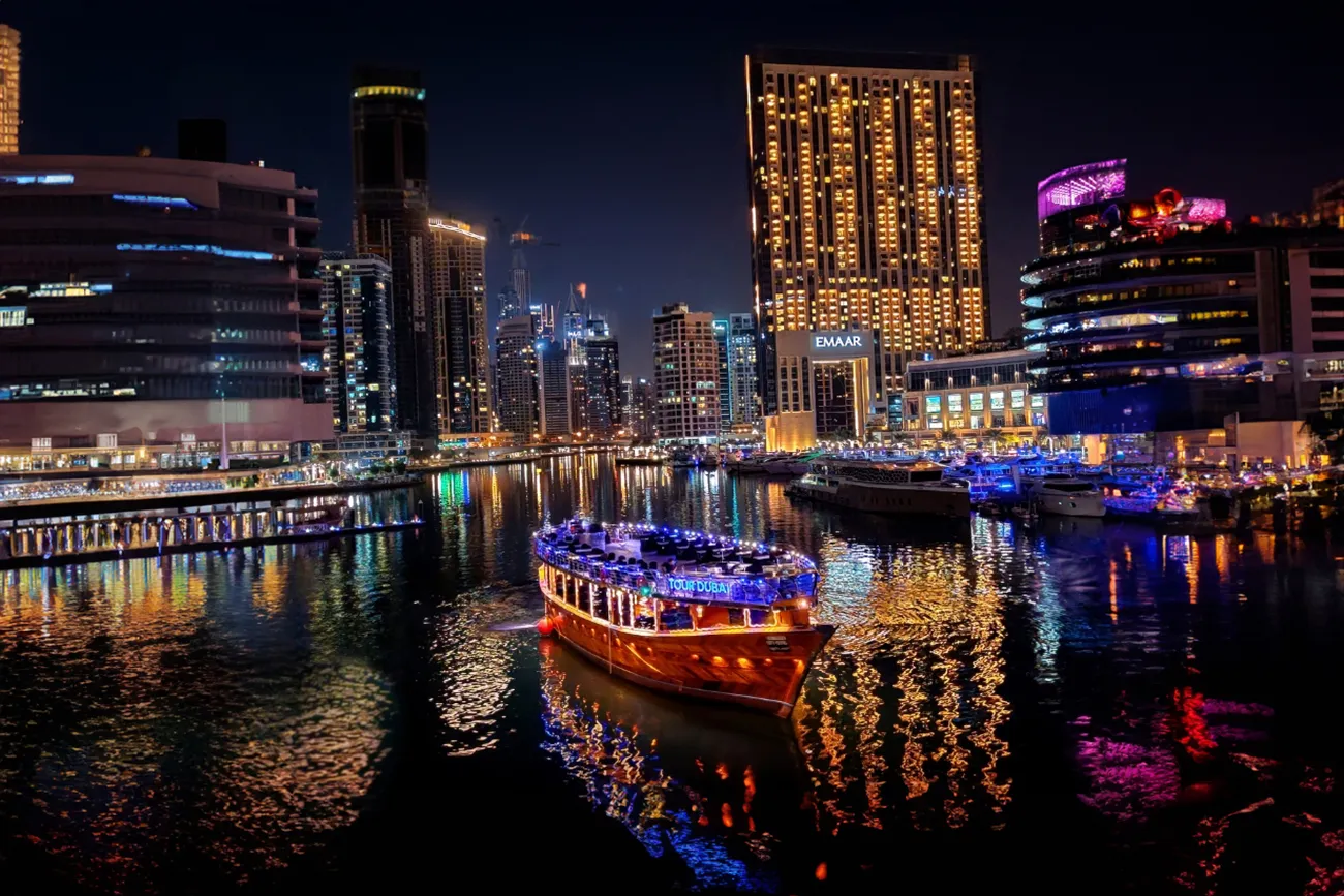 Step aboard a beautifully decorated Arabian dhow and embark on an enchanting evening cruise through Dubai Marina, one of the city’s most sophisticated waterfronts.