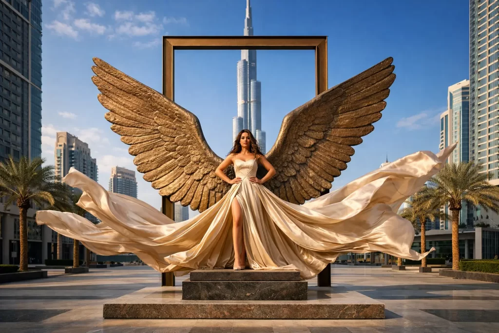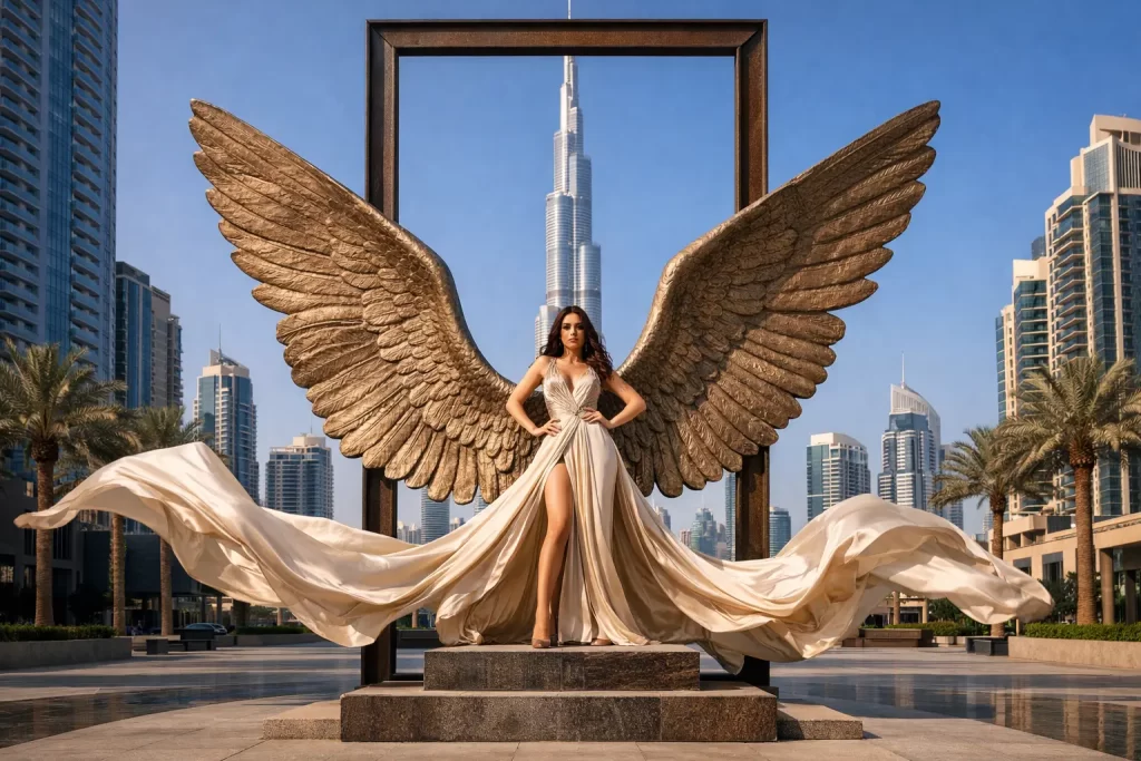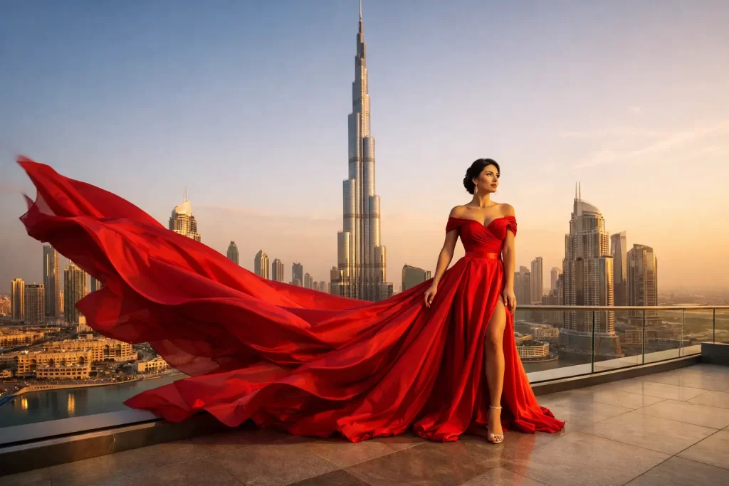Draped in a flowing designer gown, pose against golden dunes as the sun sets — a magical blend of fashion, freedom, and photography that captures your beauty in the heart of the desert.