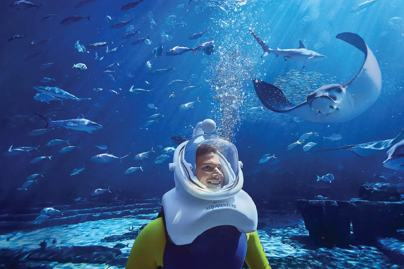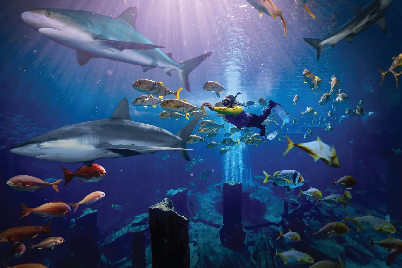 Step into the underwater world of myth and mystery at The Lost Chambers Aquarium, located inside the stunning Atlantis, The Palm. Wander through glass tunnels surrounded by 65,000 marine creatures, from graceful rays to glittering jellyfish. Perfect for families and ocean lovers — this is Dubai’s most enchanting aquatic experience!